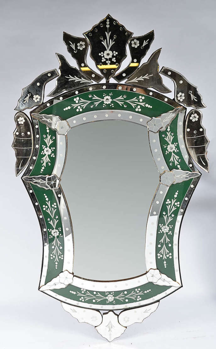 Espelho estilo veneziano, com detalhes em preto. Med. 122 x 70 cm.