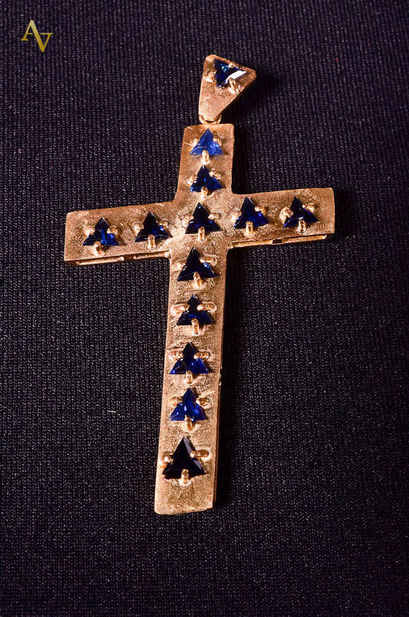 Cruz de ouro 18 k e 13 safiras triangulares. Peso total: 8,5 gr.