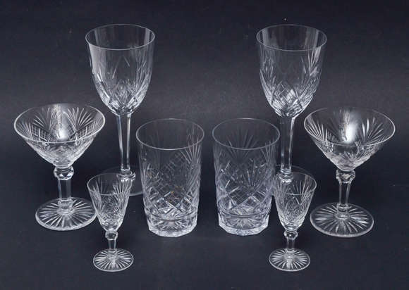 Diversos cálices de lapidações variadas, composto de 12 cálices p/ champagne, 6 p/ vinho branco, 4 p/ água, 5 p/ suco...