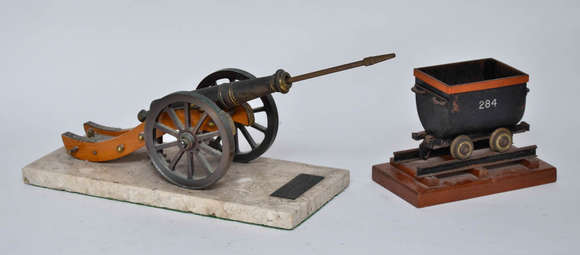 Duas miniaturas, sendo uma de canhão com base de mármore, med. 36 x 16 cm e outra de vagão de trem, base med. 11 x 18...