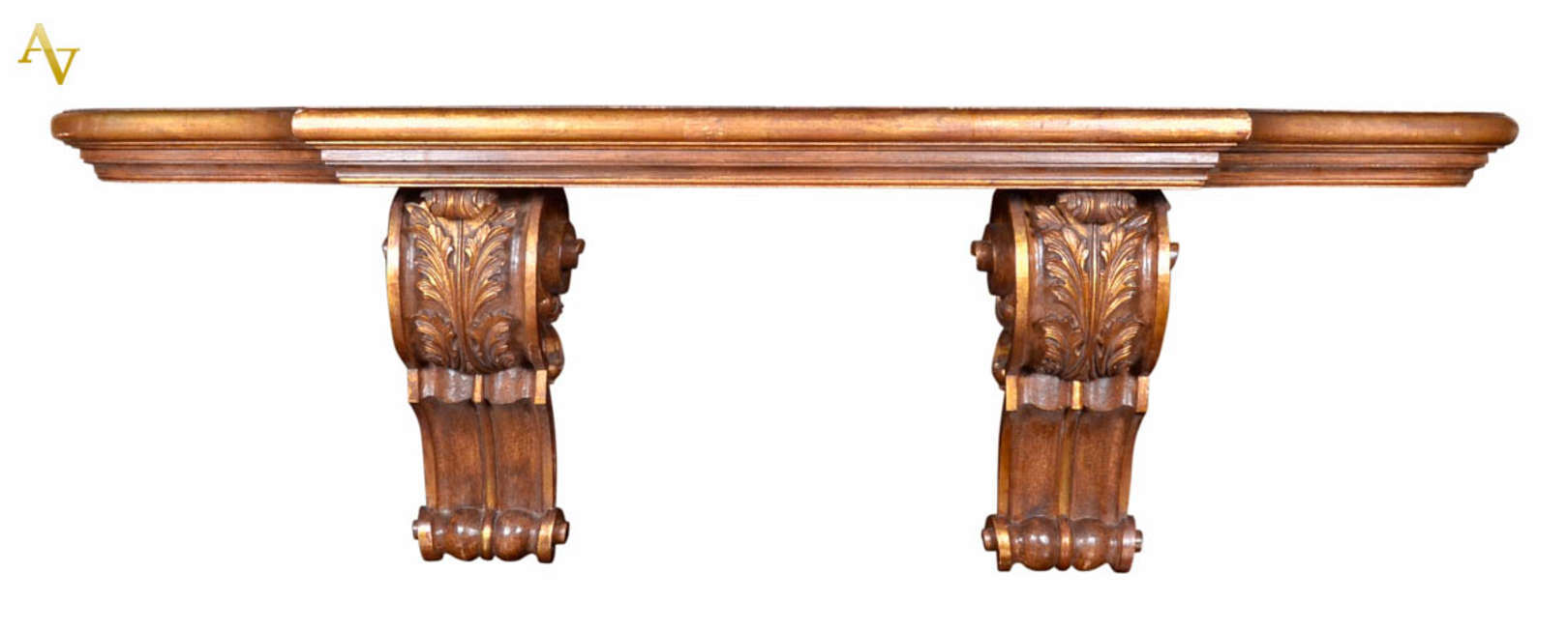 Aparador de madeira nobre entalhada e dourada, base dupla feitio peanhas. Med. 1.75 x 0,35 m - alt. 0,56 m.