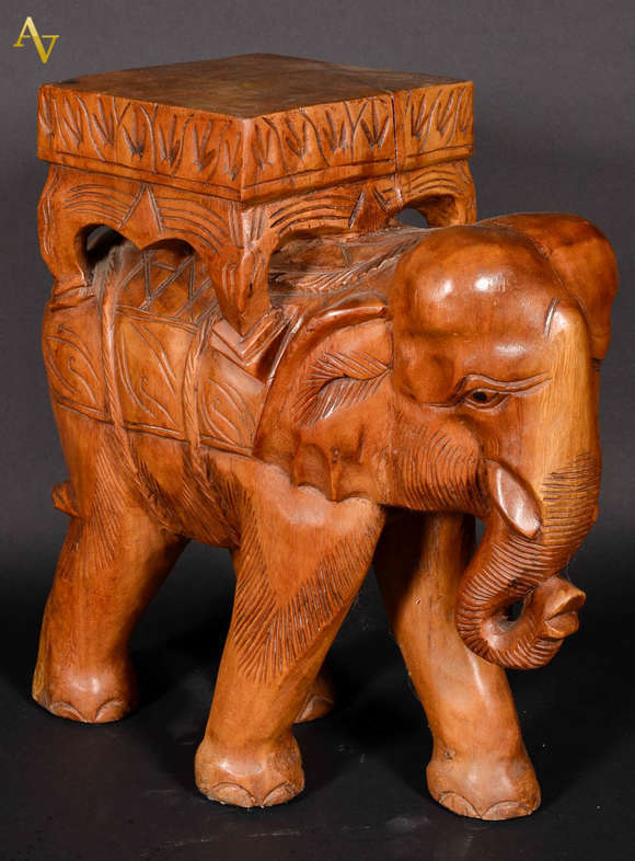 Banqueta de madeira nobre esculpida na forma de elefante. Alt. 49 cm.