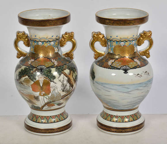 Dois vasos de porcelana japonesa decorados com figuras e paisagem em policromia, alças realçadas a ouro. Alt. 30 cm.