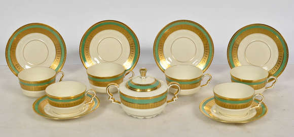 Conjunto p/ chá de porcelana Rosental, composto de 12 xícaras com pires e açucareiro, na cor verde com dourado.