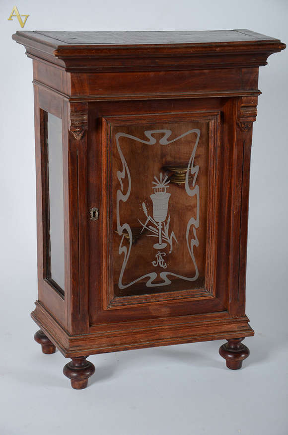 Oratório de madeira nobre com porta de vidro jateado com símbolo sacro. Med. 46 x 25 cm - alt. 64 cm.