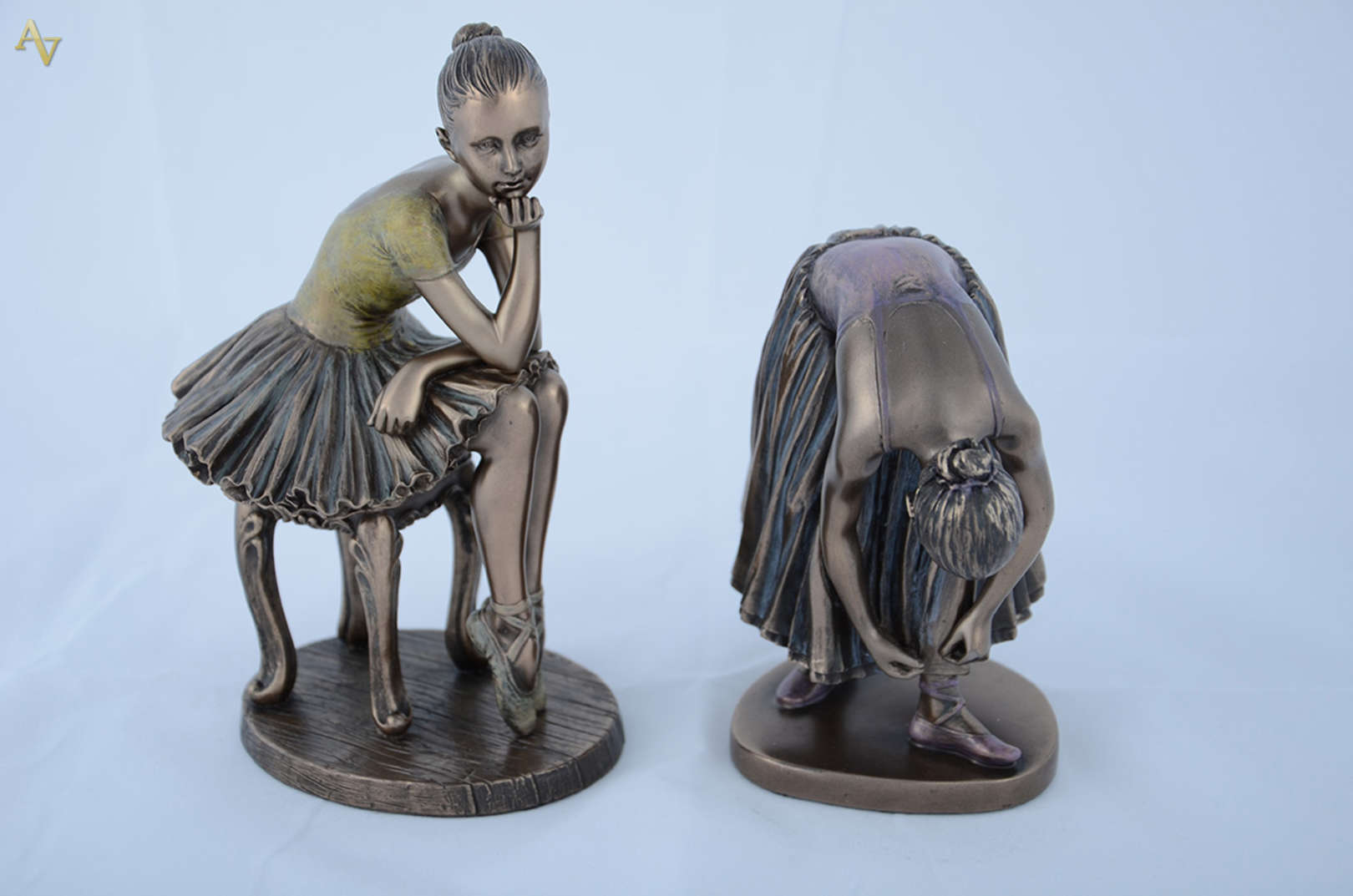 Duas bailarinas de resina dourada. Alt. 13 a 19 cm.