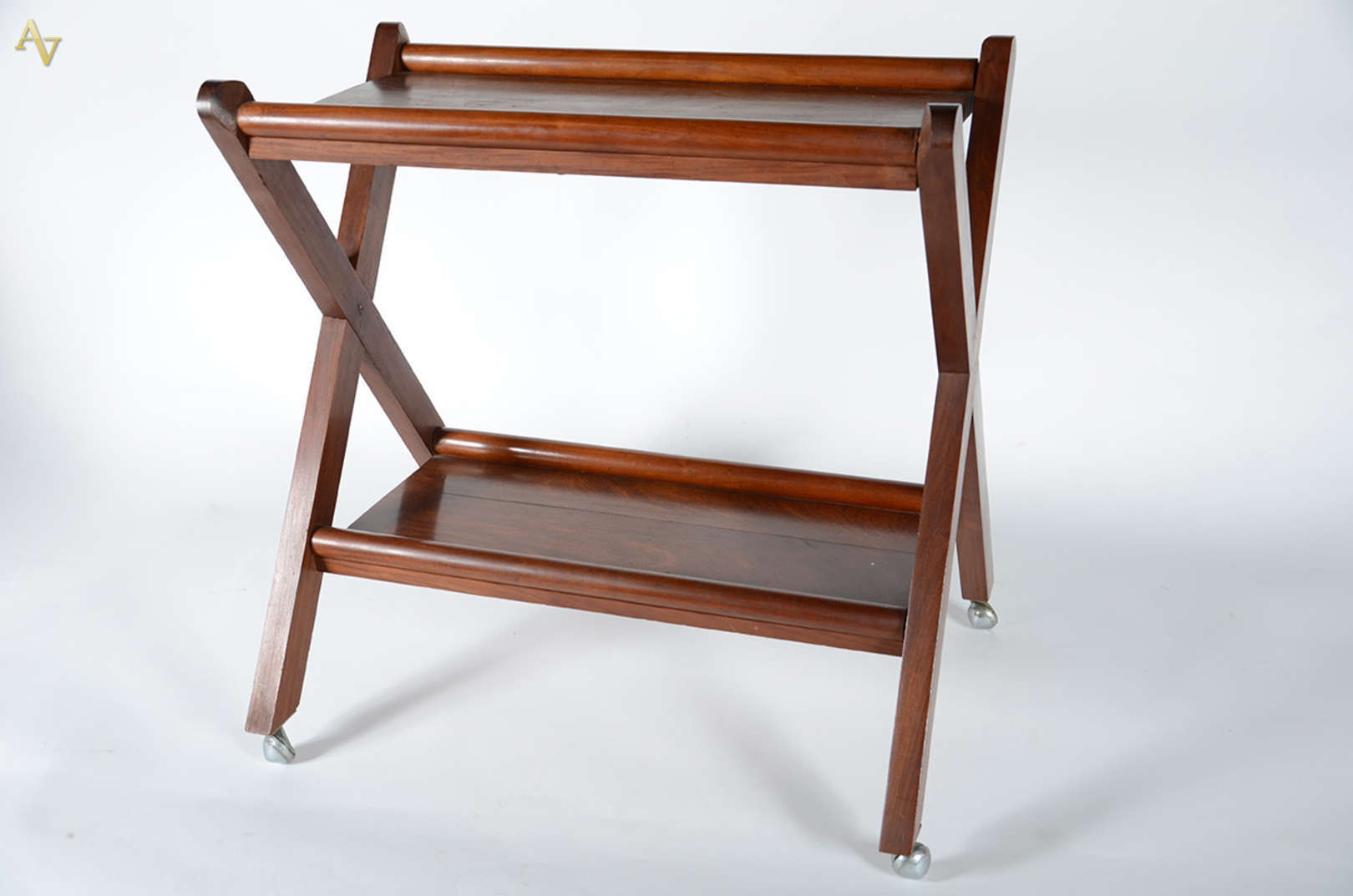 Mesa cavalete de madeira nobre, platô inferior, sobre rodízios. Med. 72 x 40 cm - alt. 71 cm.