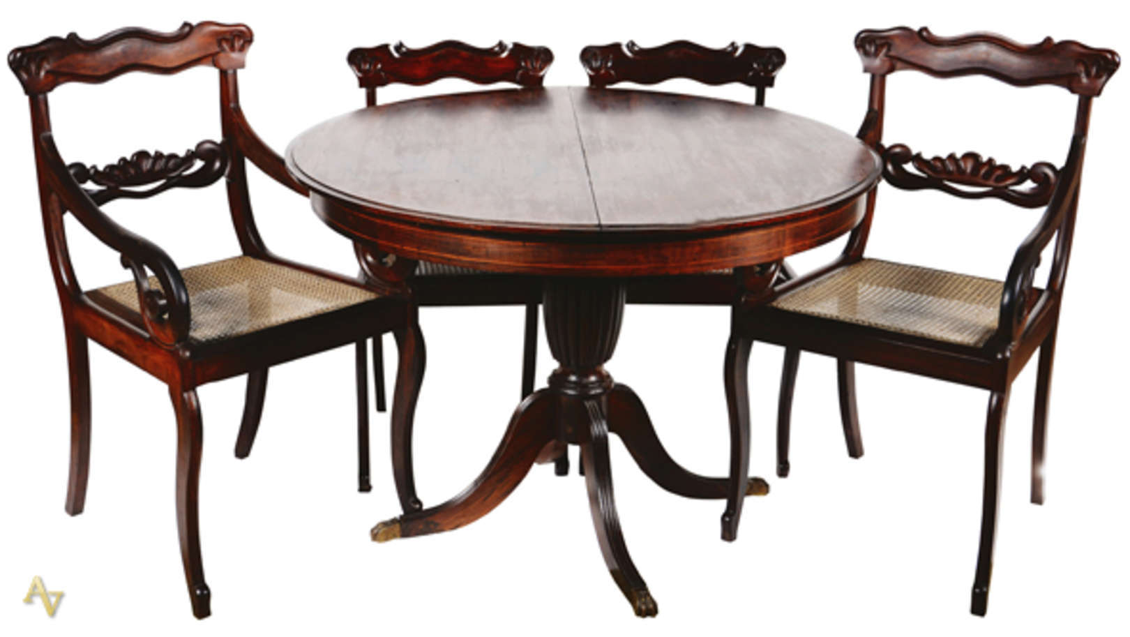 Mesa redonda com tampo parquetado, acompanha 4 cadeiras esilo inglês com assentos estofados. Diam. 1.20 m.
