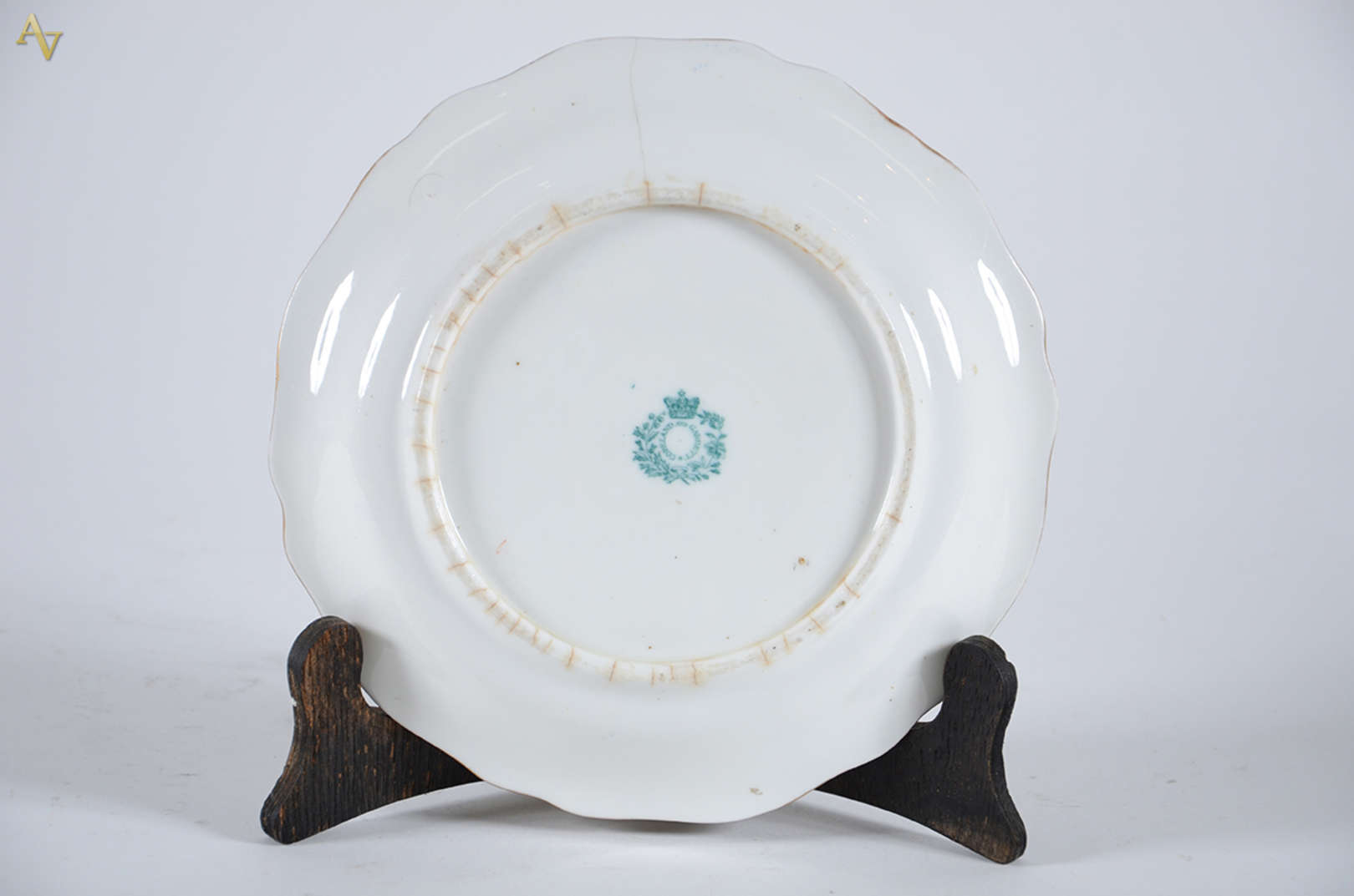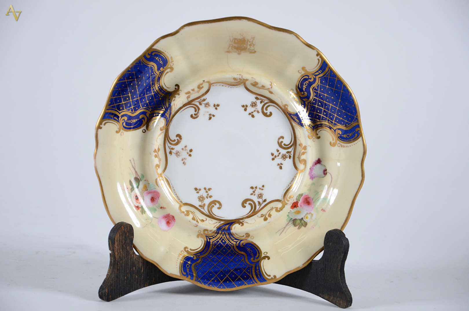 BANCO DO BRASIL - Prato raso de porcelana tcheca, borda azul cobalto e ouro, com iniciais do BB, Diam.25,5 cm.