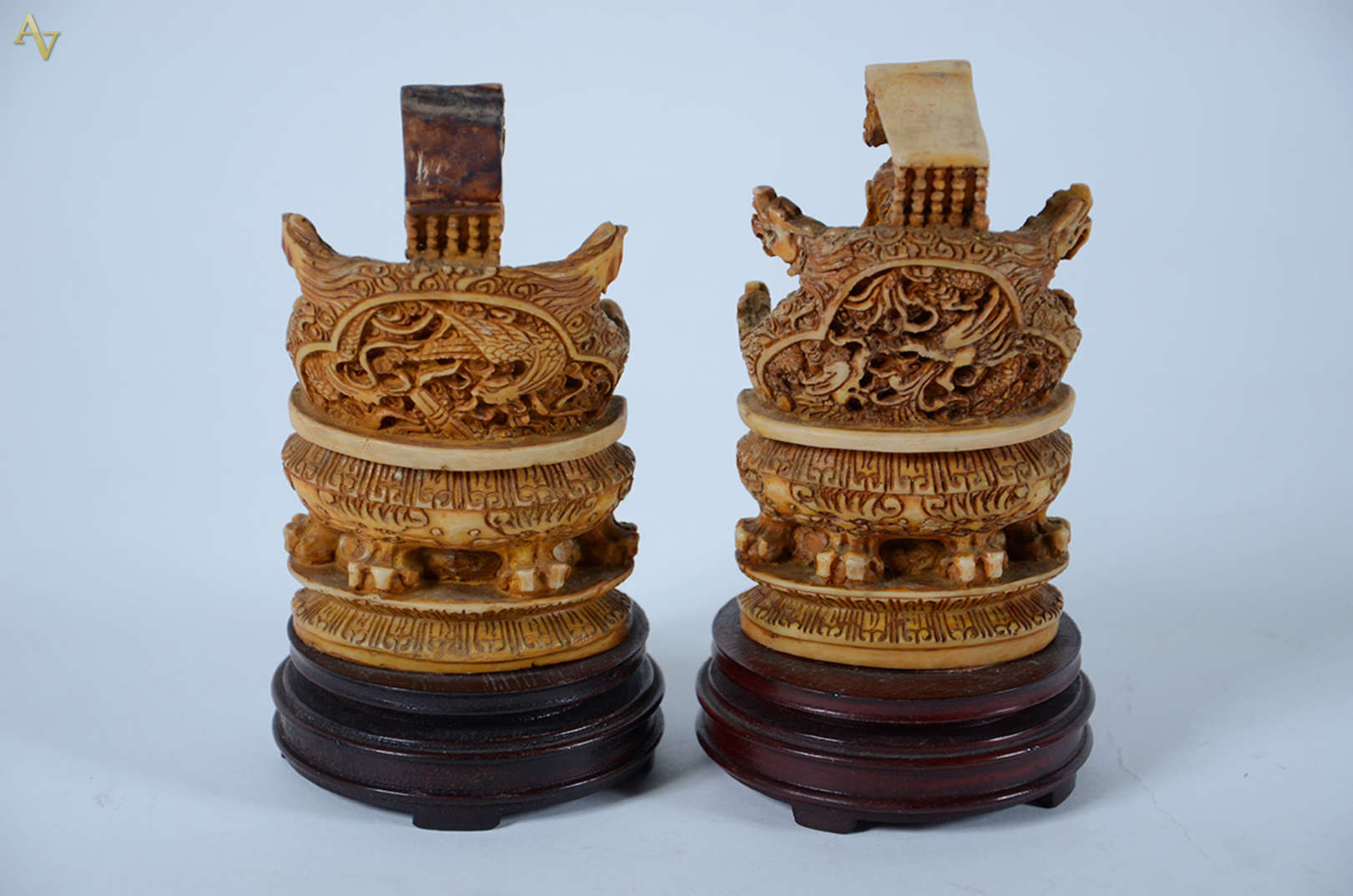 Par de Adornos europeus, madeira esculpida e lustrada, rep. grifos; bases retangulares - Séc. XIX. Med. 9 x 20 cm. Al...