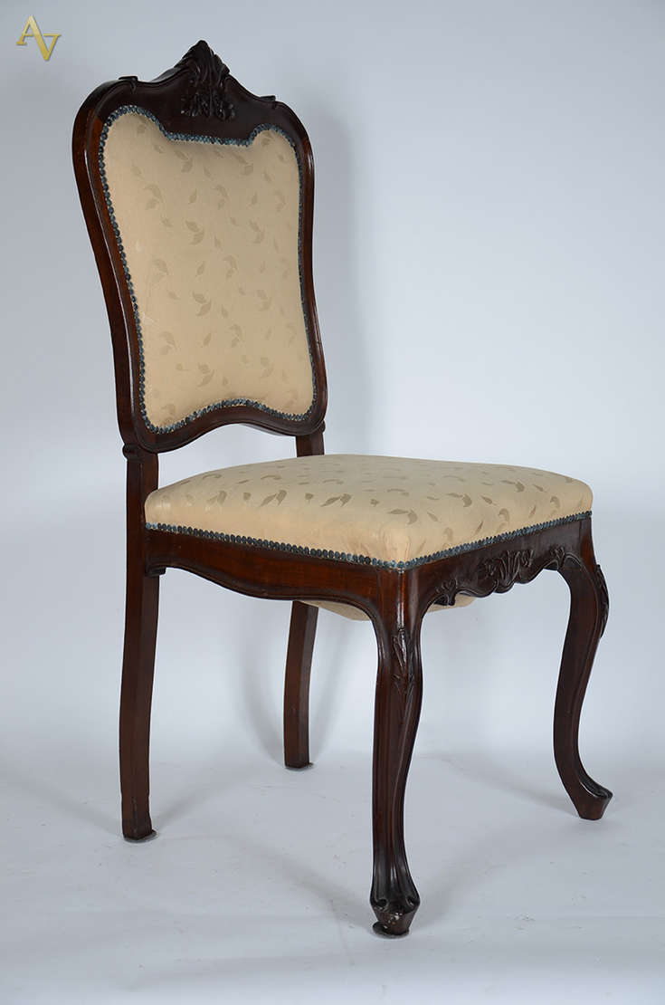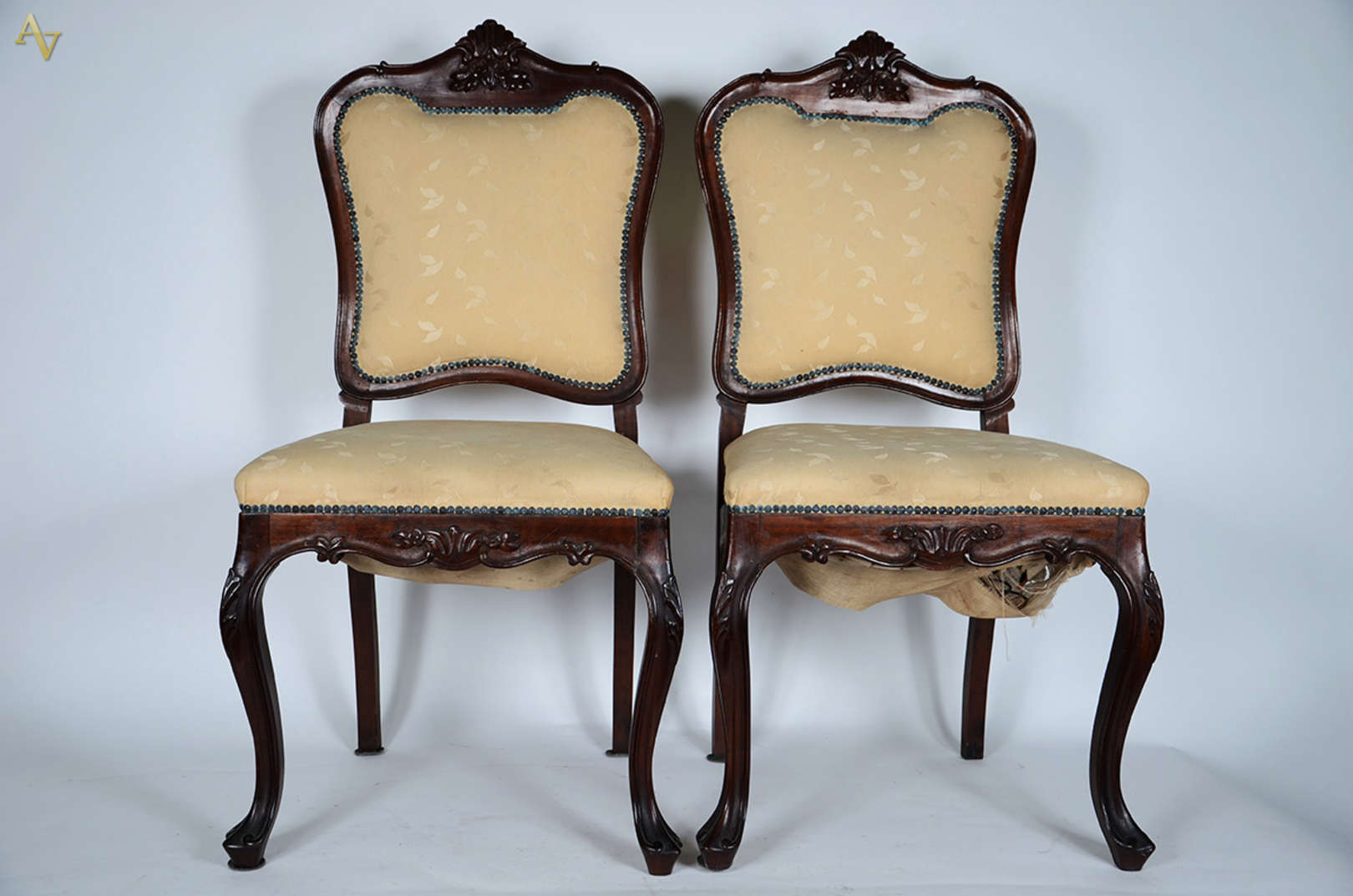 Par de cadeiras em jacarandá, assentos e encostos estofados com tecido salmon e tacheados, ponteiras de bronze.