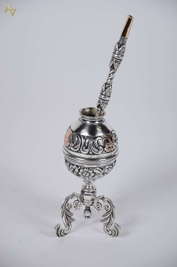 Bomba (alt.18 cm.) e cuia (alt.14 cm) para chimarrão, de prata com flores em relevo (não apresenta contraste), tres p...