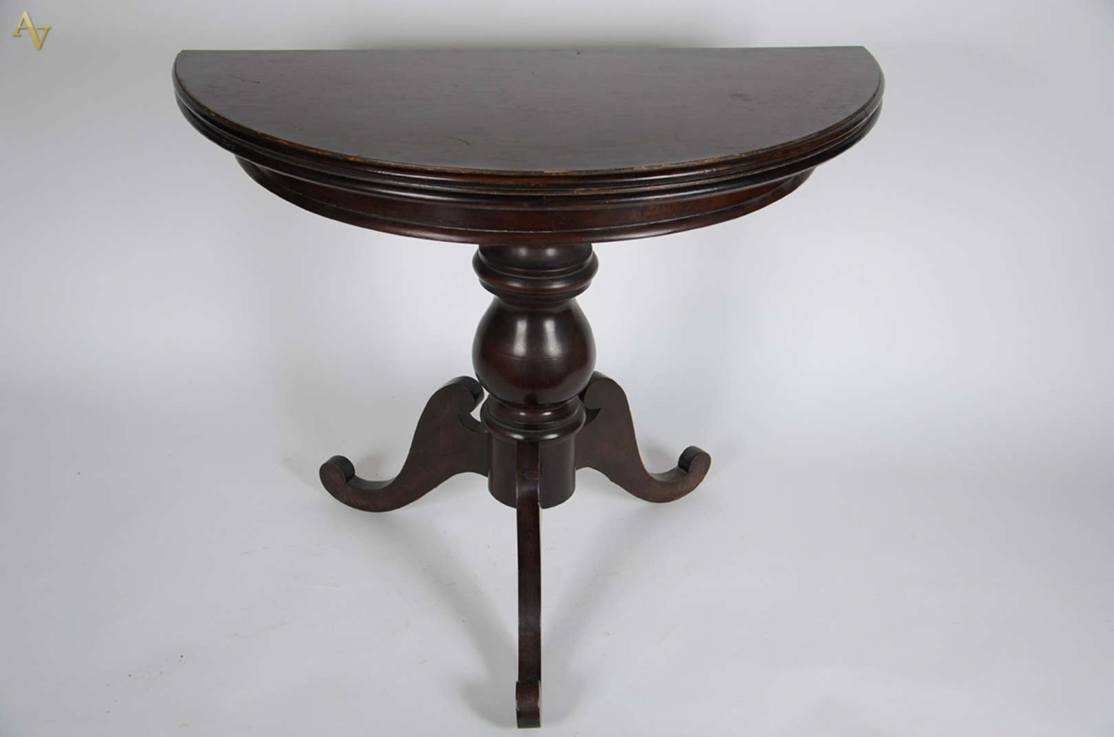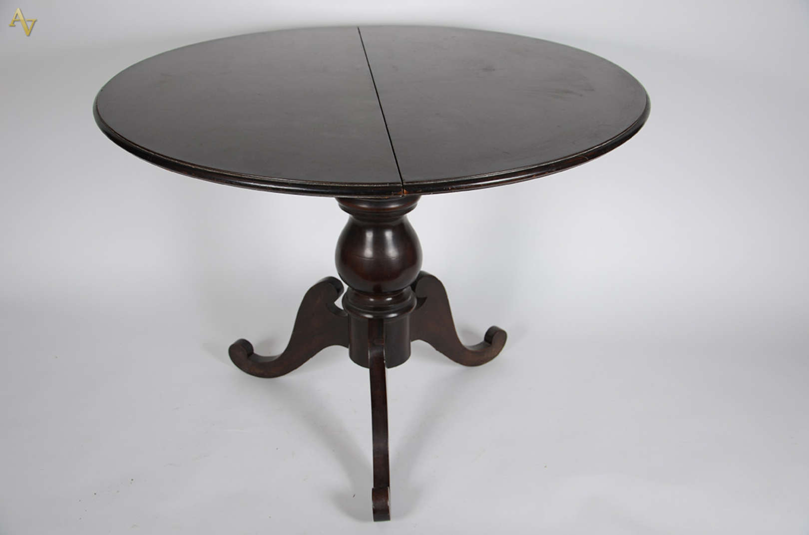Mesa redonda em jacarandá, reversível em console, com pé torneado. Diâmetro: 100 cm