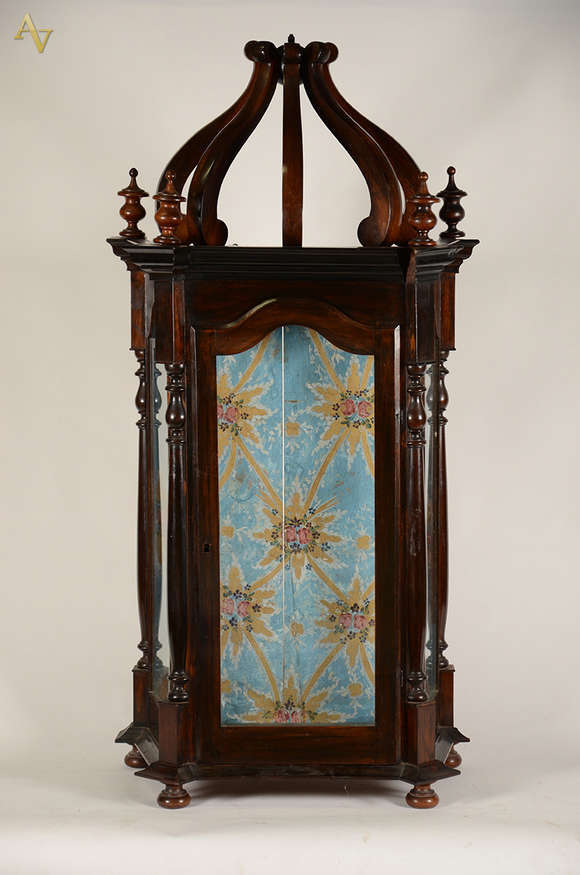 Antigo oratório de jacarandá, parte interna com policromia, pinturas a ouro e representação do Divino Espírito Santo....