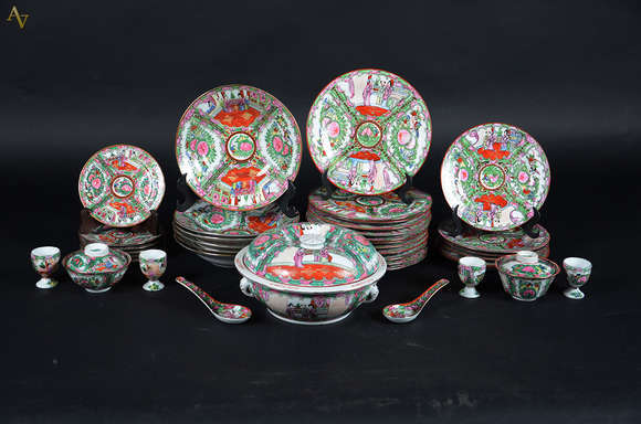 Aparelho de jantar em porcelana oriental, decorada ao gosto da Família Rosa, com 12 pratos rasos, 6 pratos fundos, 6 ...