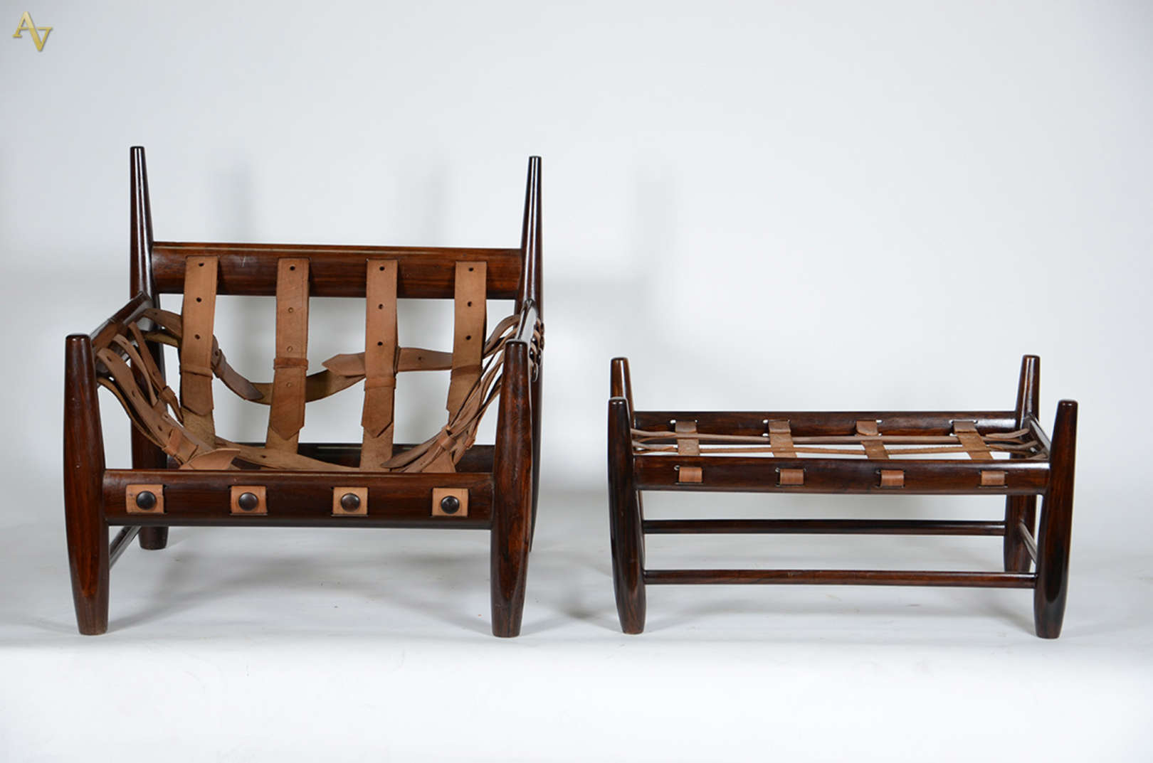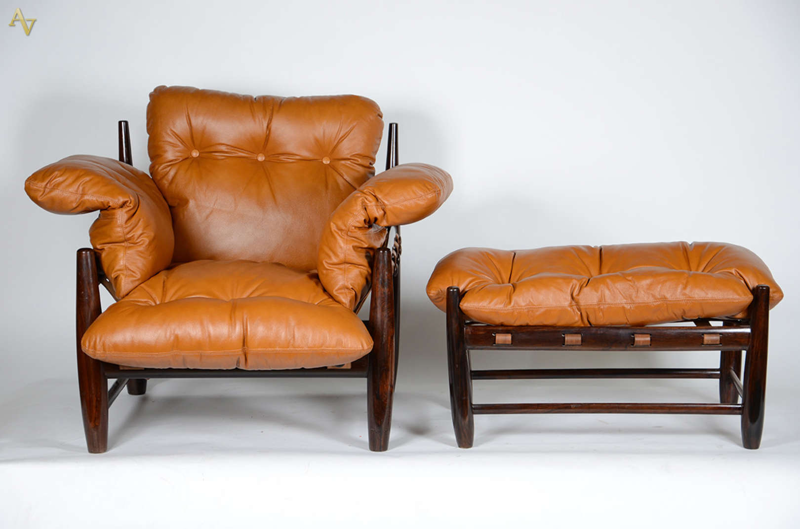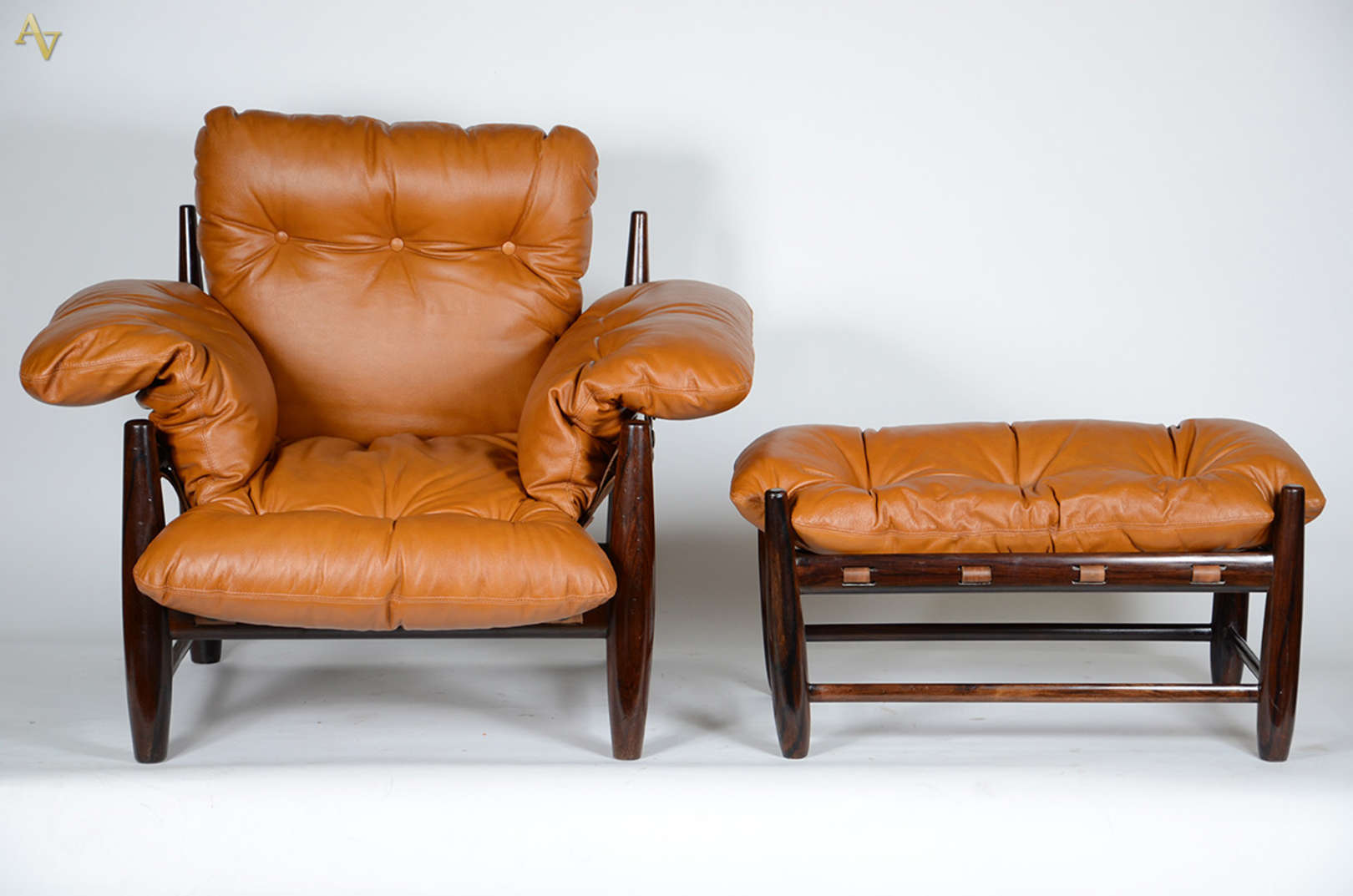 SERGIO RODRIGUES - Poltrona mole com banqueta, estrutura de jacarandá maciço torneado, com travessas que permitem a p...
