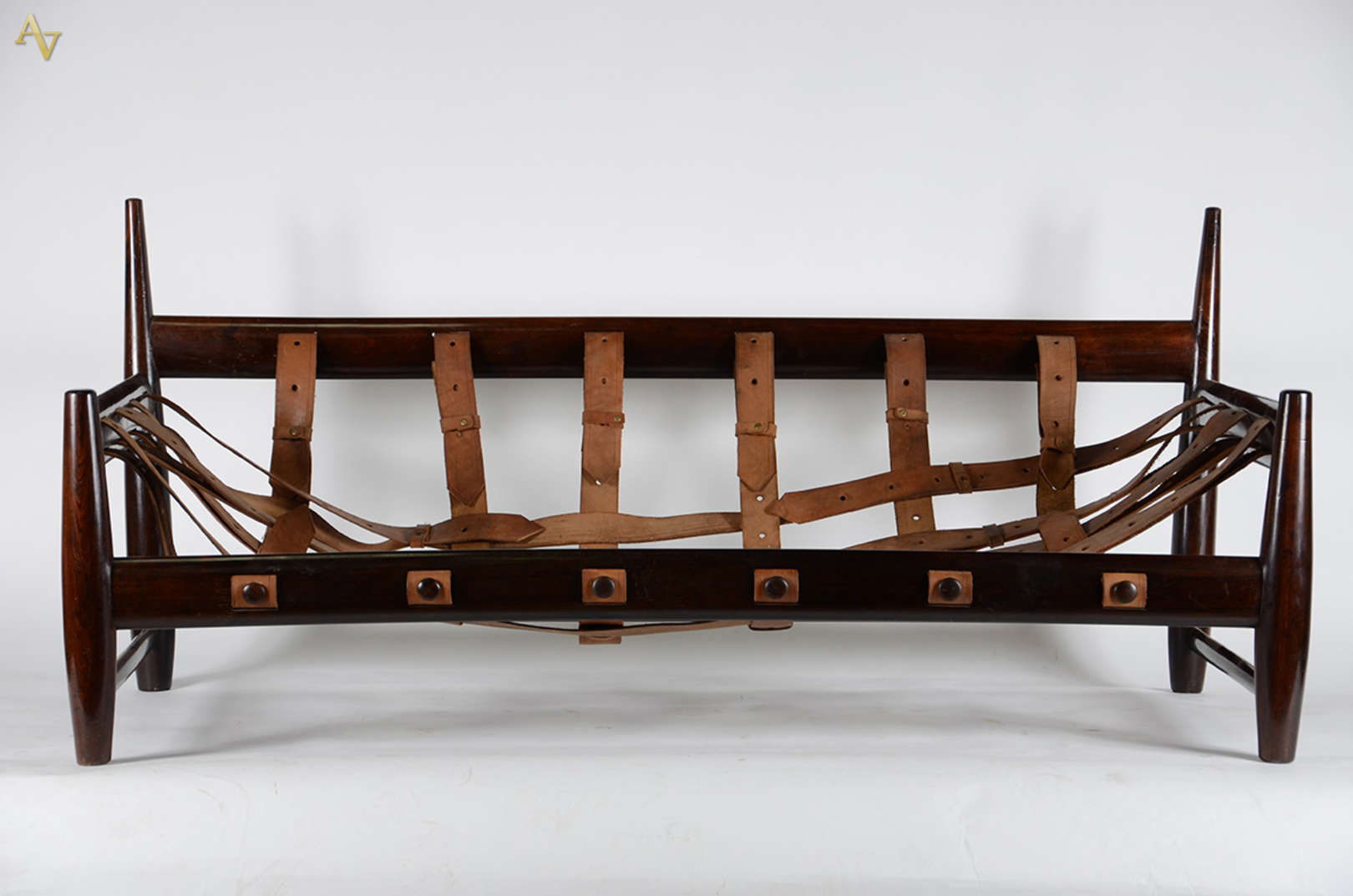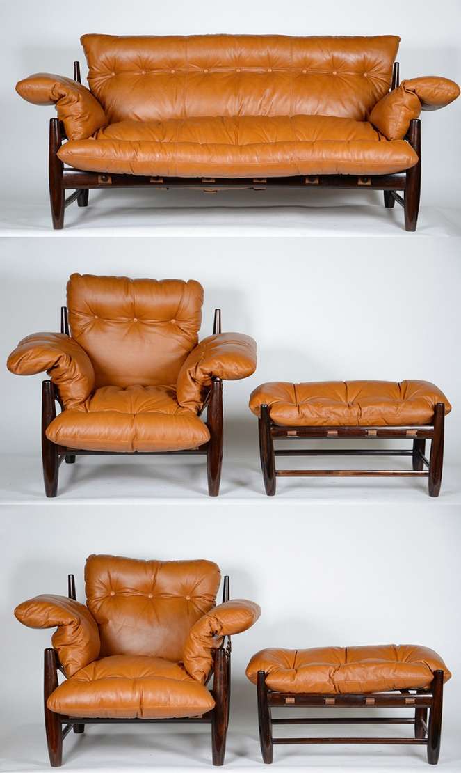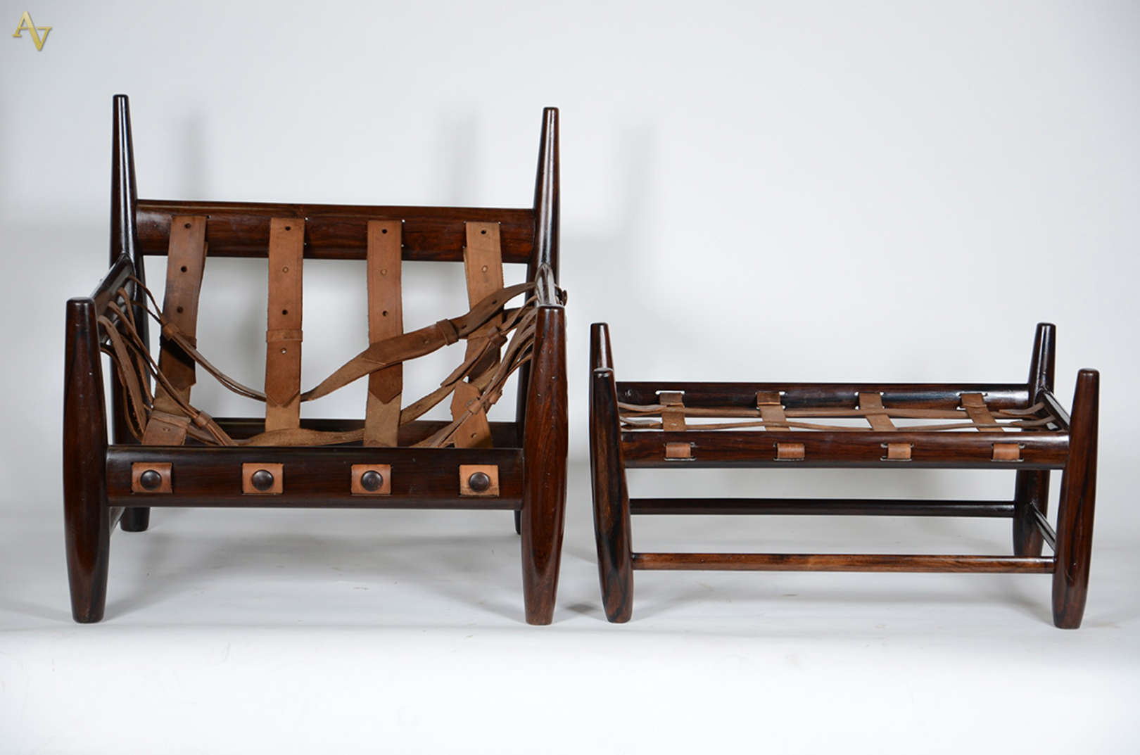 SERGIO RODRIGUES - Poltrona mole com banqueta, estrutura de jacarandá maciço torneado, com travessas que permitem a p...