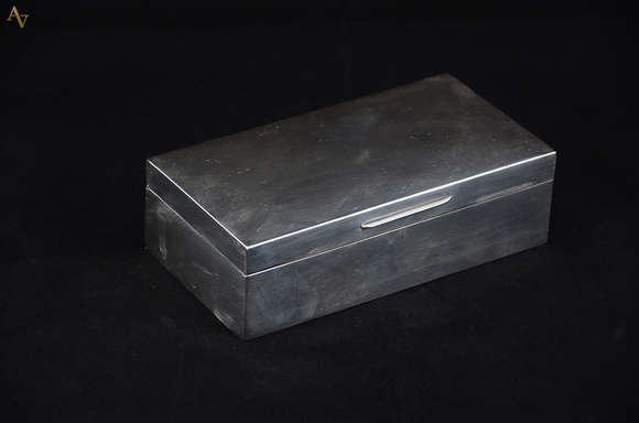 Caixa cigarreira de prata inglesa (pequenos amassados), med. 17,5 x 9 cm. altura 5,5 cm.