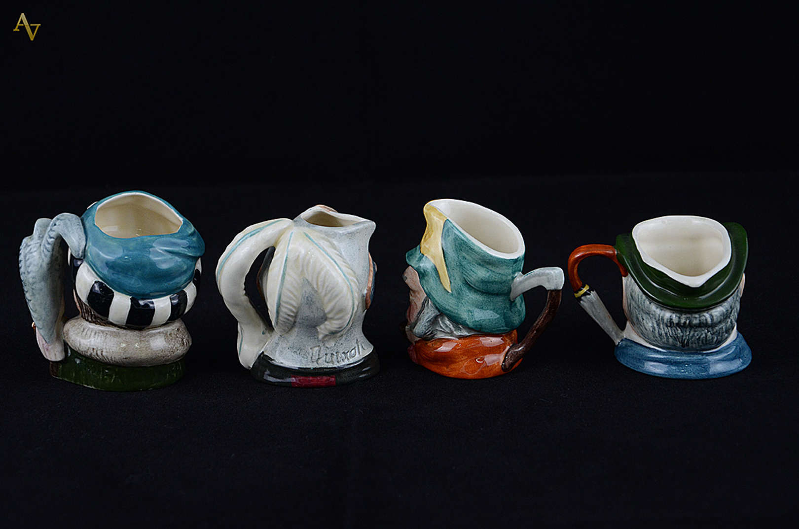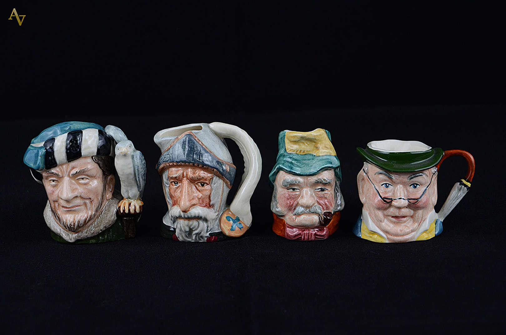 Conjunto com três canecas de porcelana sendo duas da marca Royal Doulton e uma de porcelana alemã Goebel. Alturas 6,5...