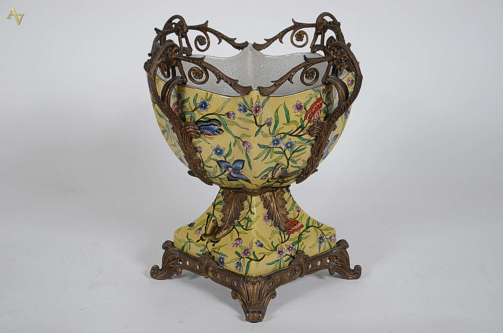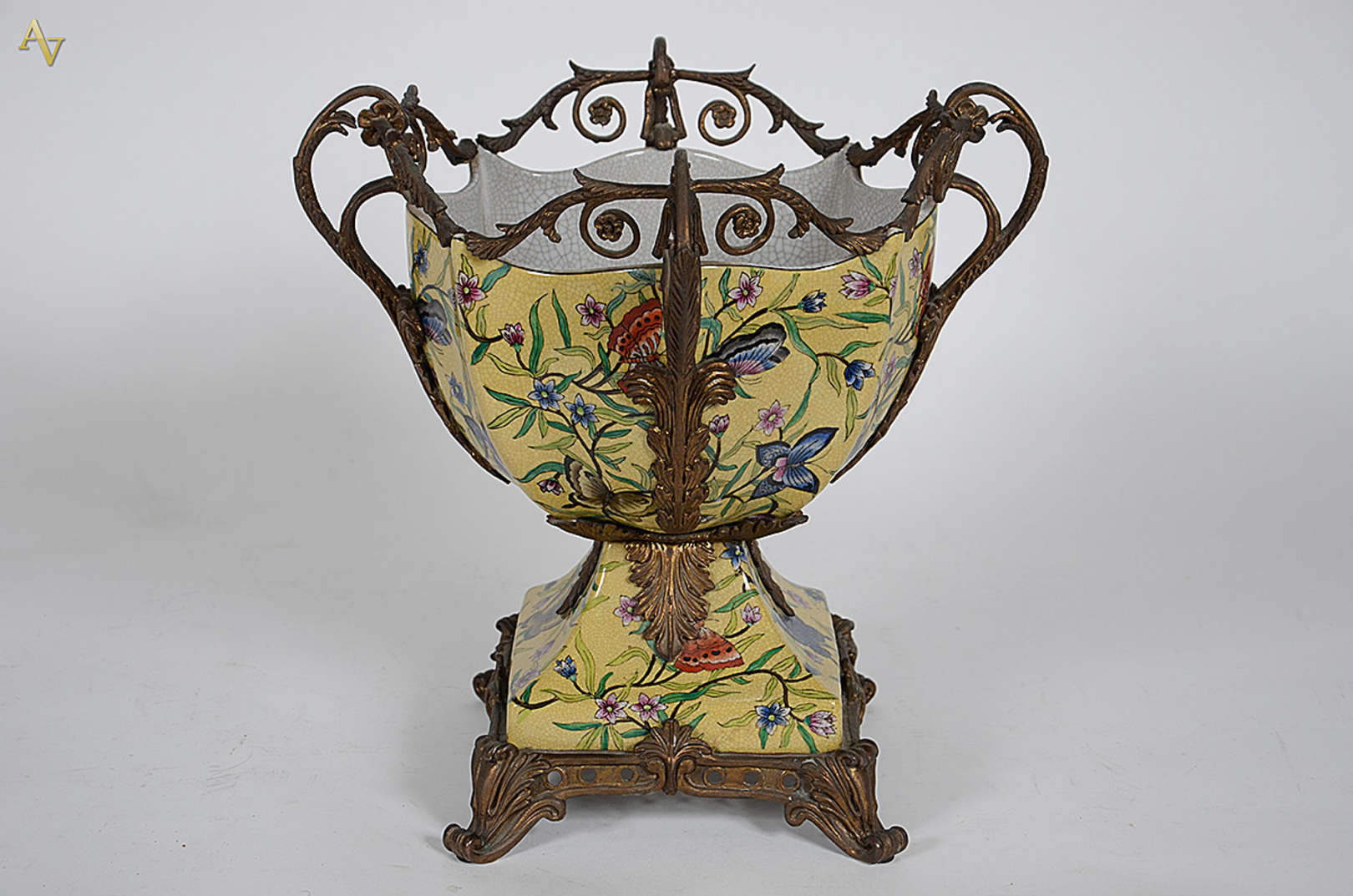 Prato de porcelana guarnecido ao redor com bronze vazado. Diâmetro 28 cm.