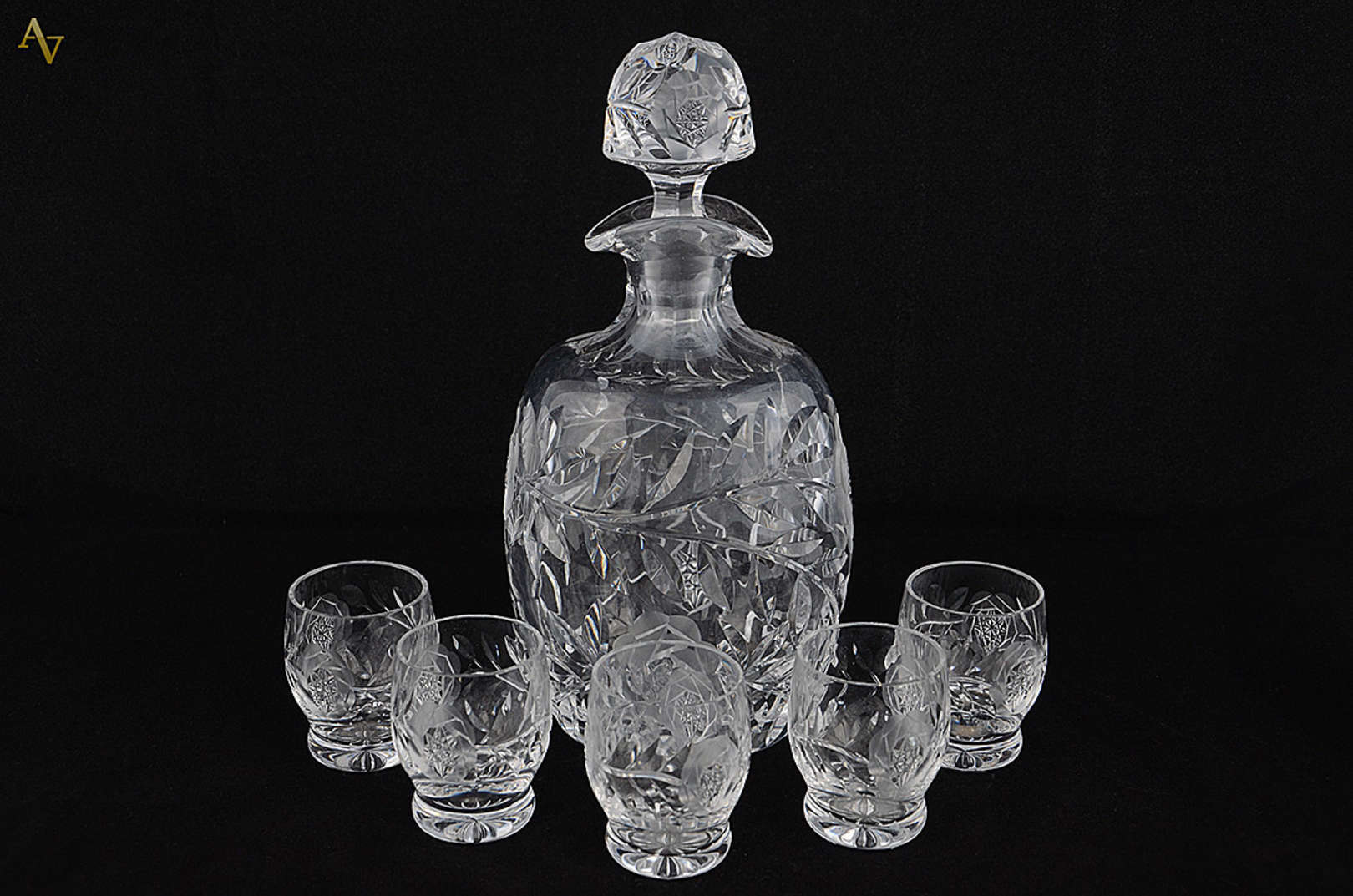 Serviço de cristal europeu lavrado com pequenas flores, composto de 5 flutes, 6 cálices para vinho tinto, 6 para vinh...