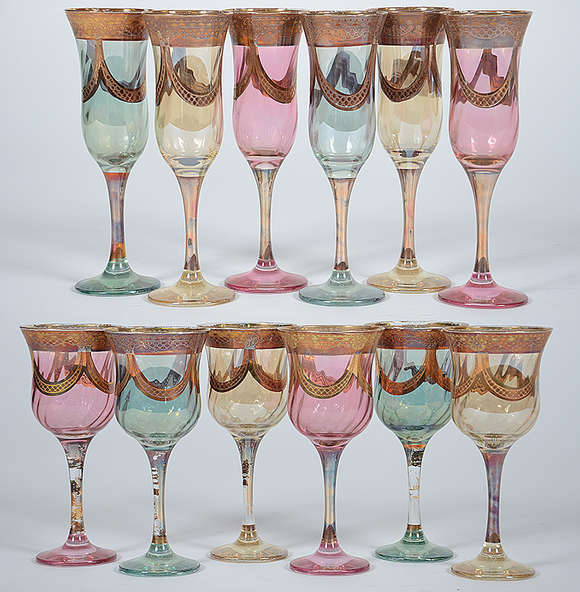 Conjunto com 6 flutes e 6 cálices para vinho furtacor com detalhes dourados.
