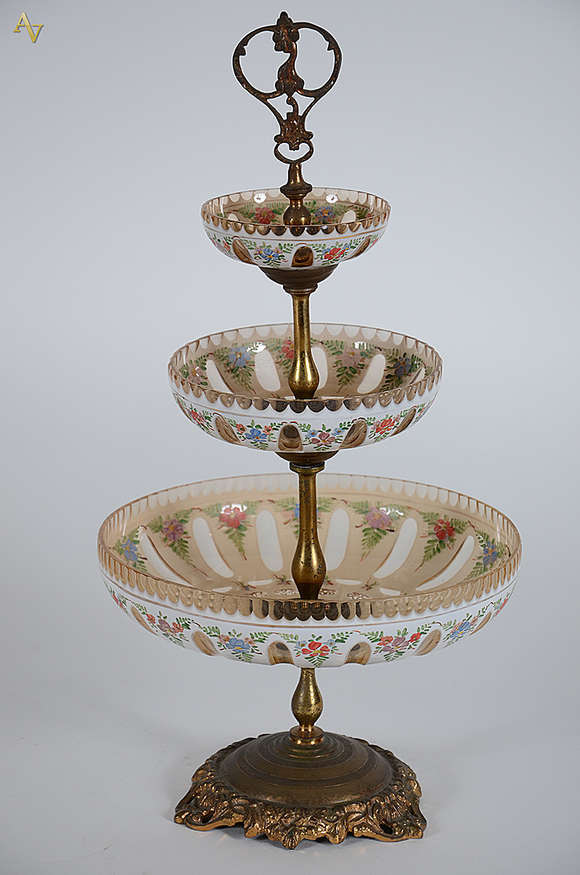 Fruteira de cristal com borda decorada com corações vazados e base de bronze, altura 36 diâmetro 34 cm.