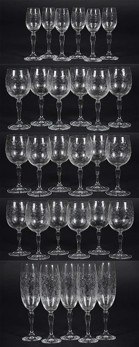 Serviço de cristal europeu lavrado com pequenas flores, composto de 5 flutes, 6 cálices para vinho tinto, 6 para vinh...