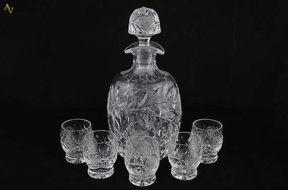 Licoreira com cinco copinhos de cristal lapidado. Altura da garrafa: 25 cm.