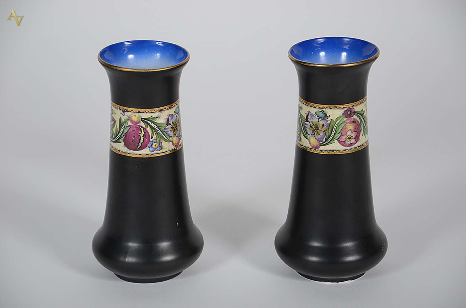 Par de jarros de porcelana inglesa JOHN TAMS, grega com frutos em policromia. Altura 20,5 cm cada.