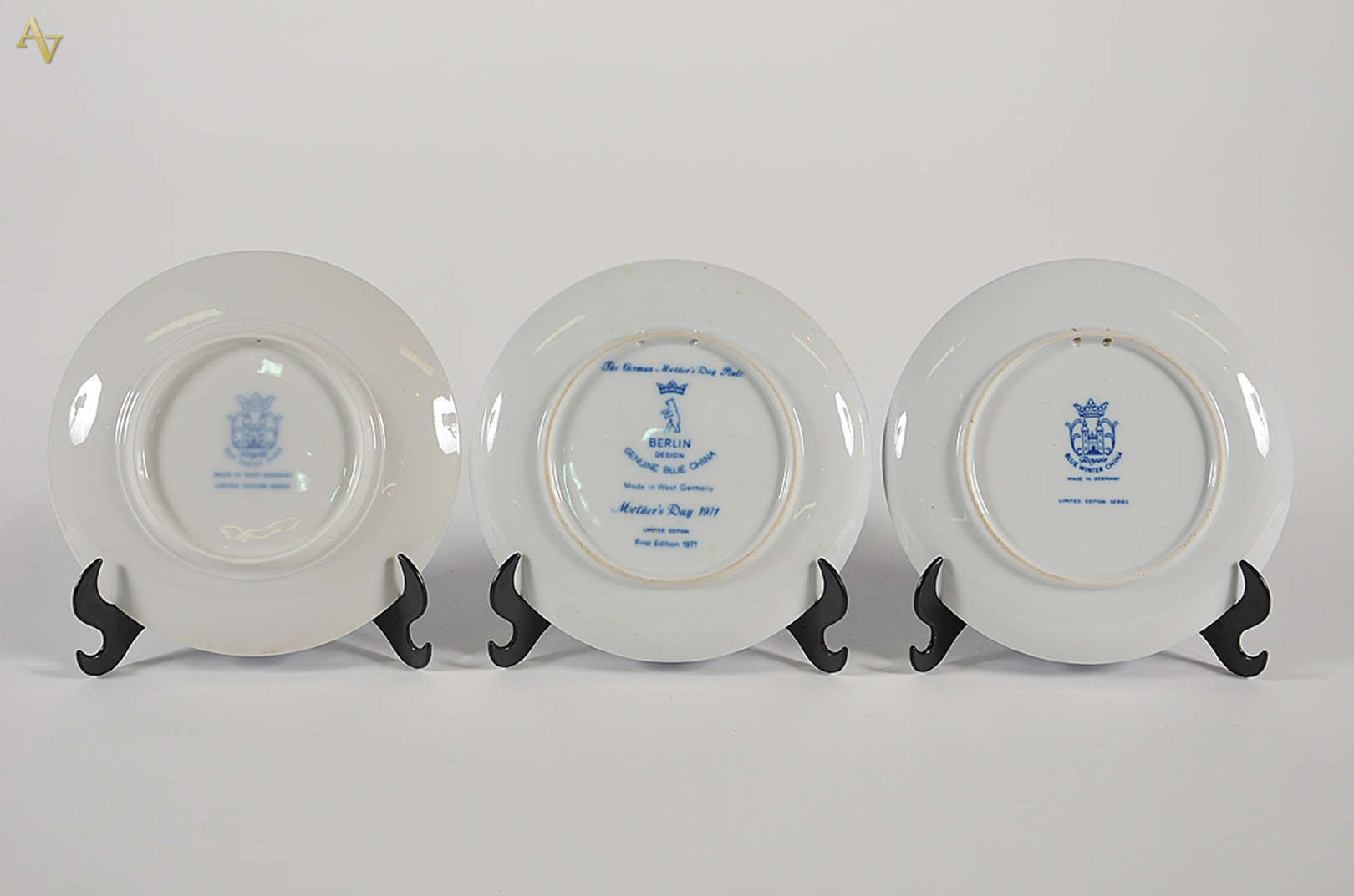 Par de pratos de porcelana americana pintados à mão com guaxinins em policromia, borda azul cobalto e dourado - Diâme...