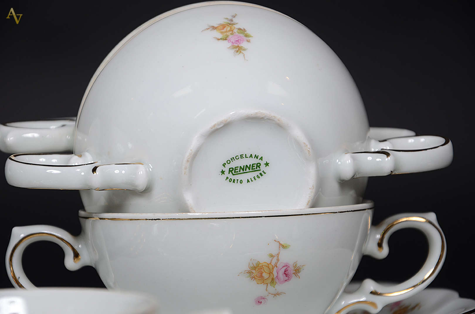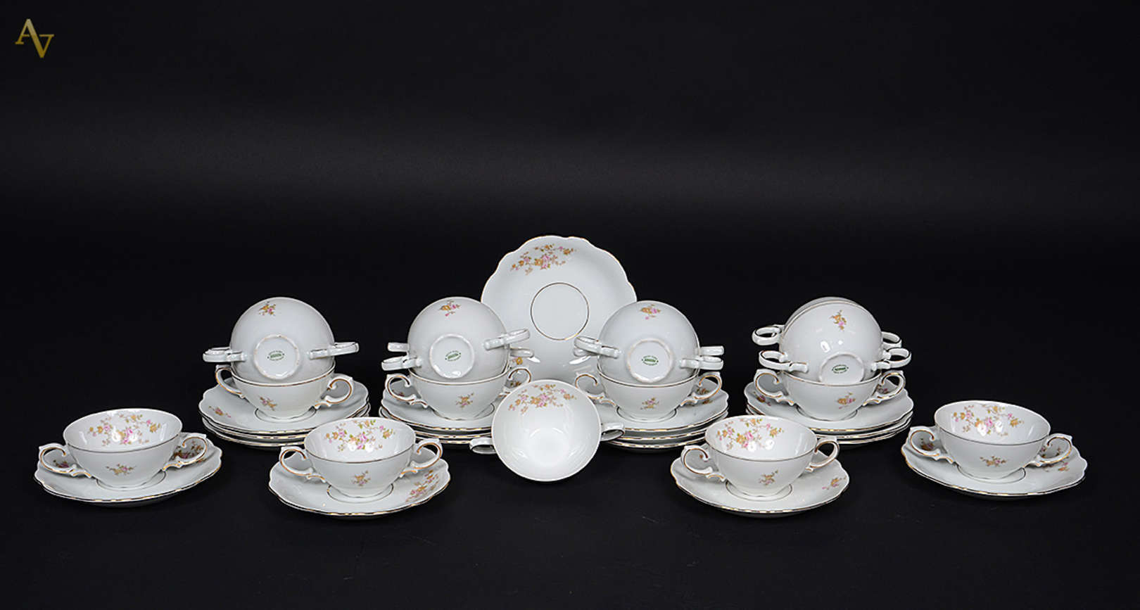 Parte de conjunto de jantar de porcelana tcheca com desenhos florais, composto de sete peças: um prato, duas sopeira...