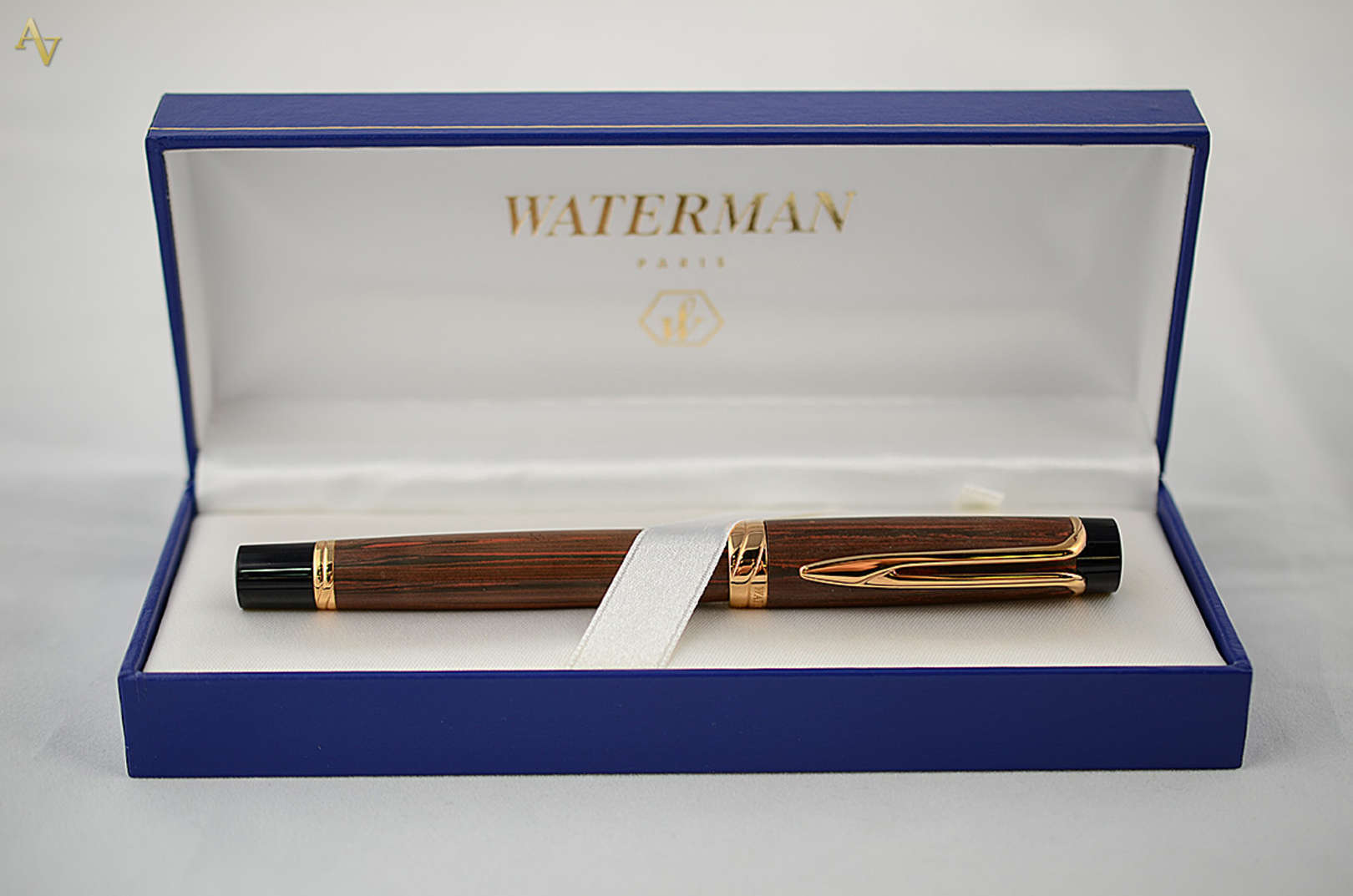 WATERMAN - Caneta tinteiro francesa, modelo jacarandá com detalhes em plaque or. Acompanha livreto, certificado e embalagem. Sem uso.