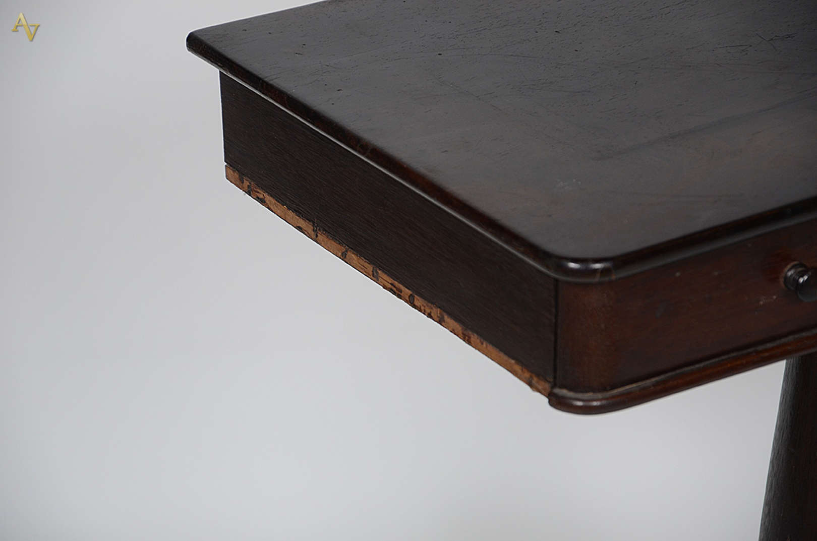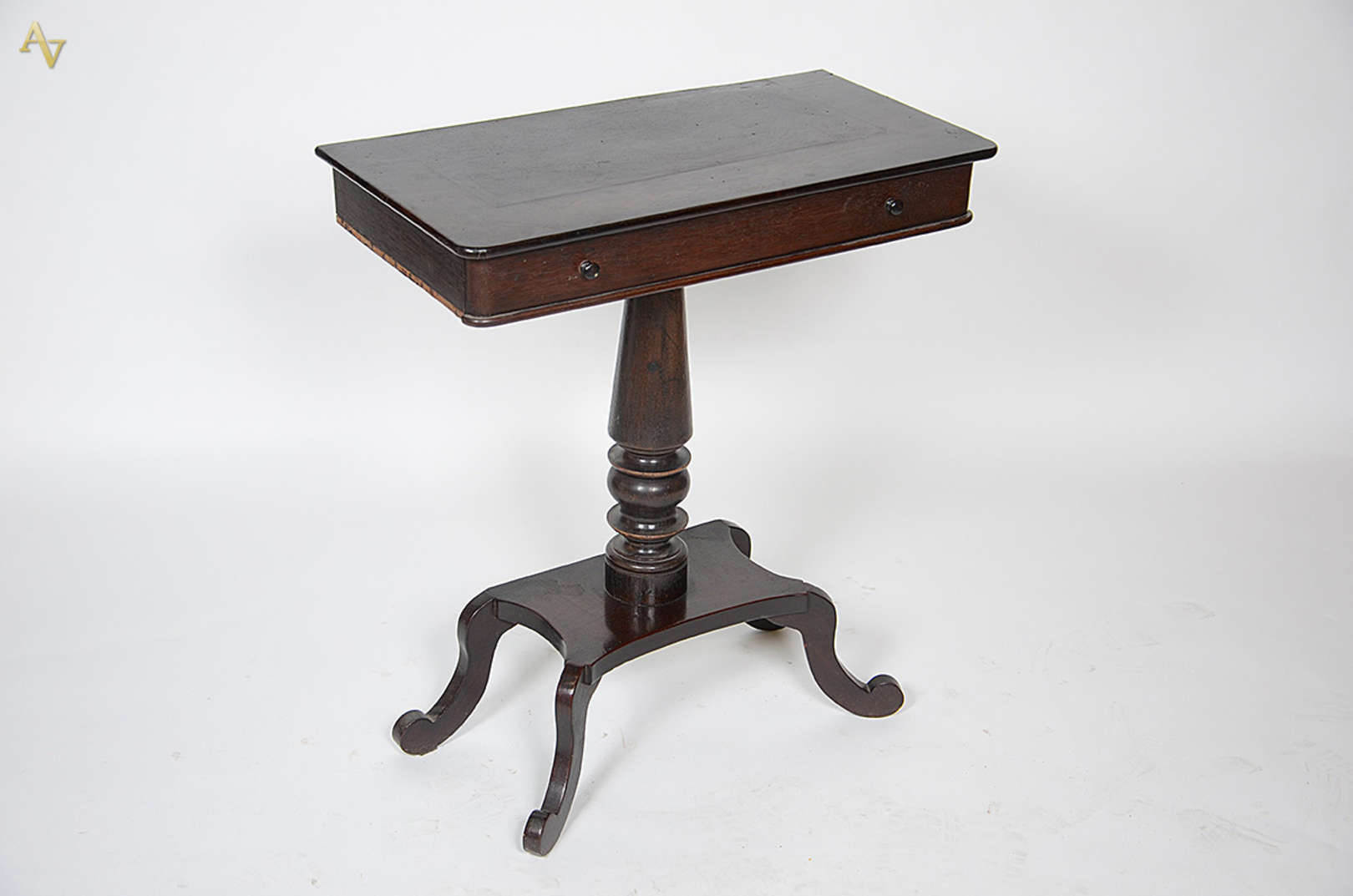 Aparador de jacarandá com uma gaveta, coluna central terminando em platô inferior com 4 pernas recurvas. Medidas 0,71 x 0,38 m e altura 0,78 m (falta um arremate lateral).