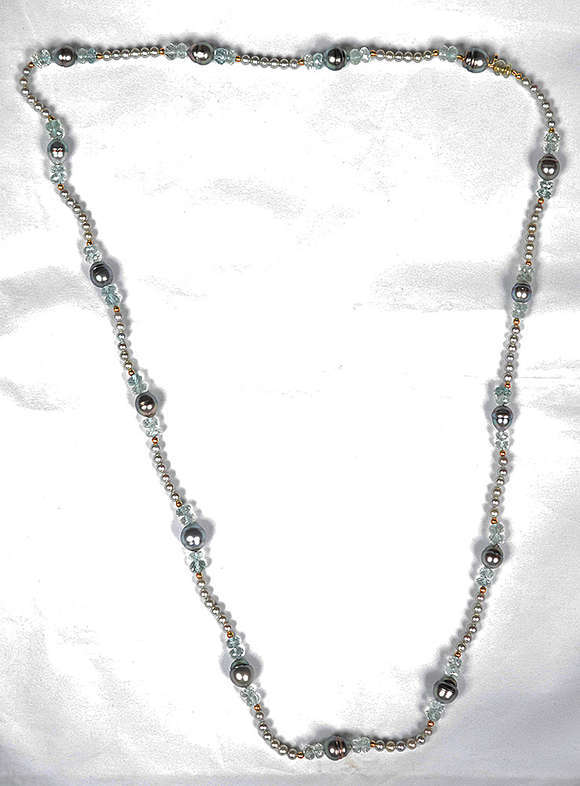 Colar com acqua e pérolas Thaiti, detalhes em ouro amarelo 18 k. Comprimento 94 cm.