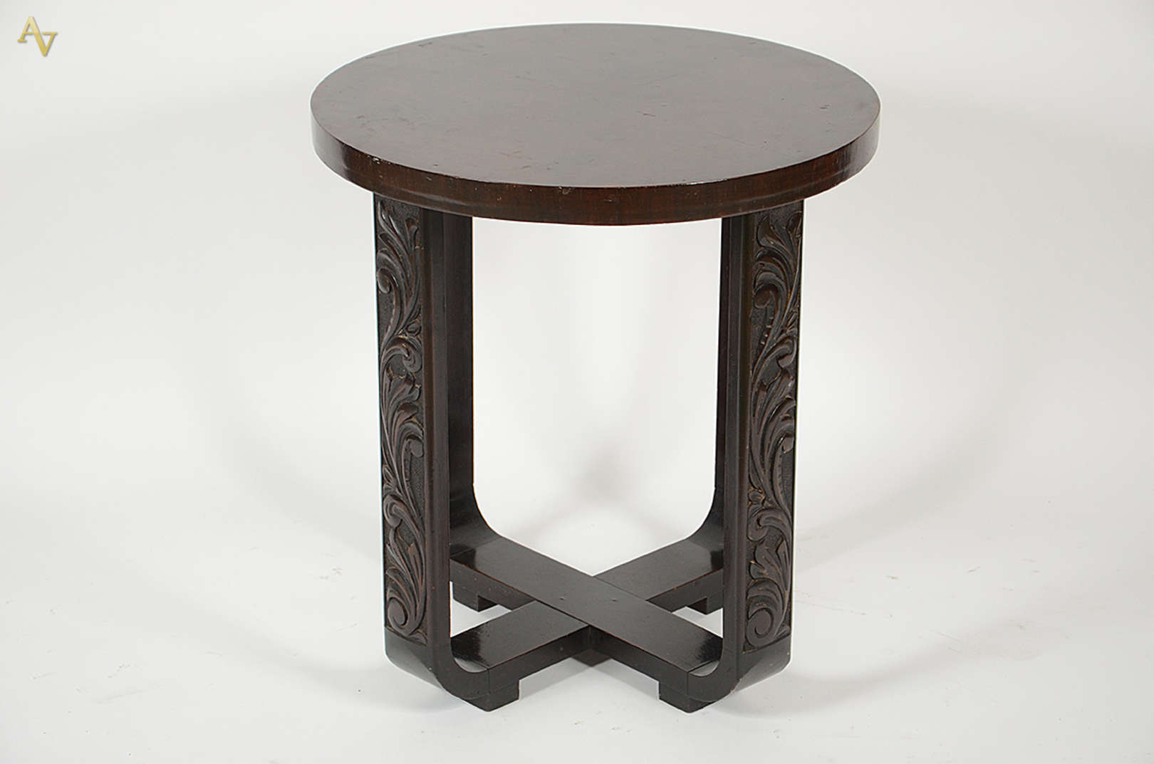 Mesinha redonda de jacarandá, base feitio tripé e ponteiras de bronze feitio garra. Altura 0,75 m e diâmetro 0,50 m.