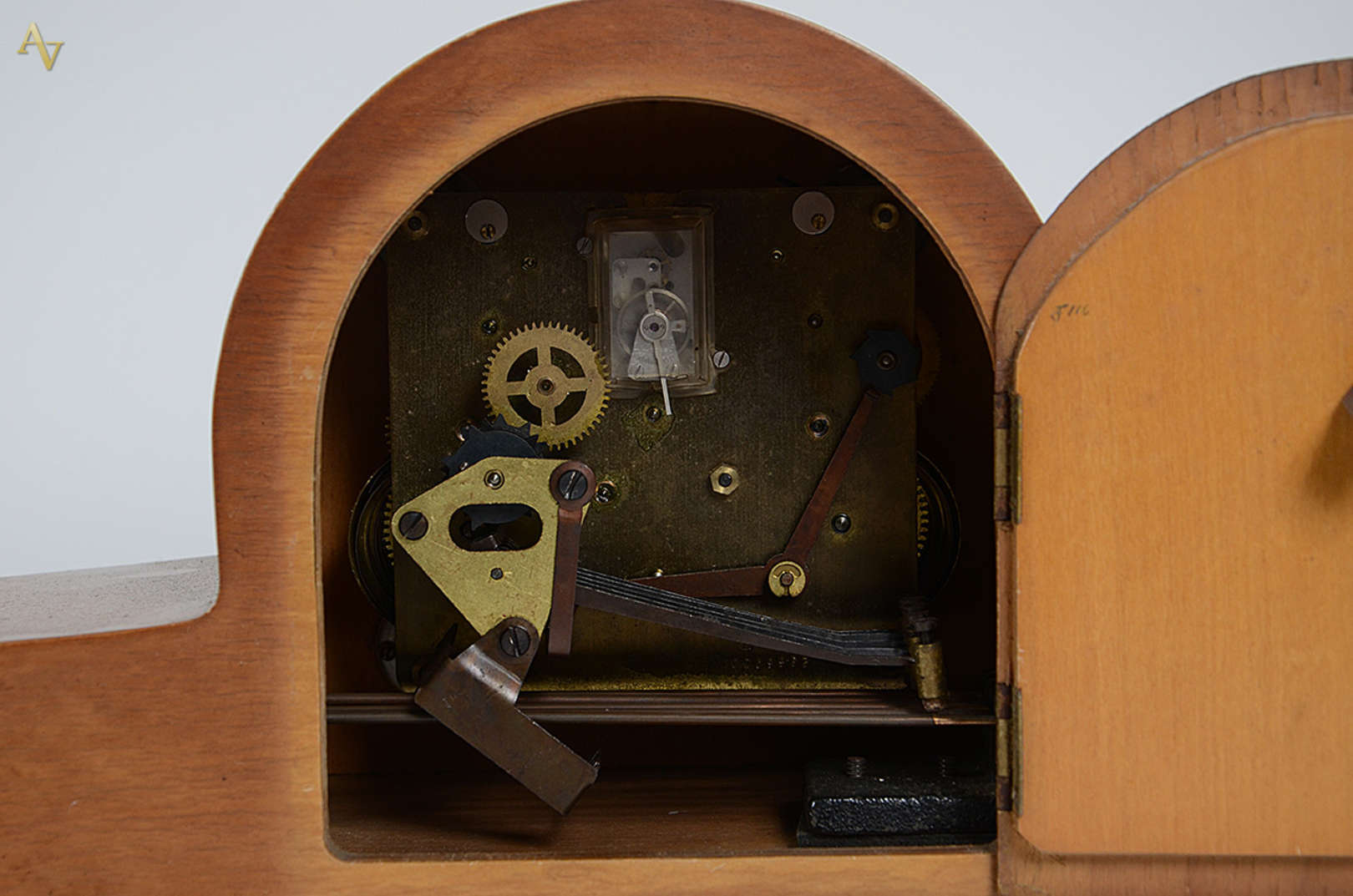 Relógio de mesa com caixa de madeira (marca na parte posterior R.A.). Medidas 44 x 12 cm e altura 23 cm (máquina parada)