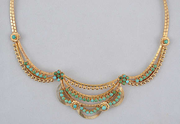 Gargantilha de ouro amarelo 18 k modelo oriental com turquesas. Peso total 58,6 g - Comprimento 41 cm.