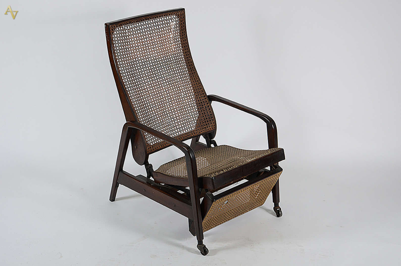 Cadeira de balanço reclinável de madeira nobre com palhinha (Pequenos defeitos na palhinha) e pernas frontais sobre rodízios.