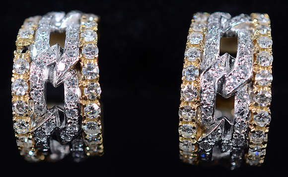 Par de brincos de ouro 18 k e ouro branco feitio argola cravejada de brilhantes. Peso total 19 g (falta um pequeno br...