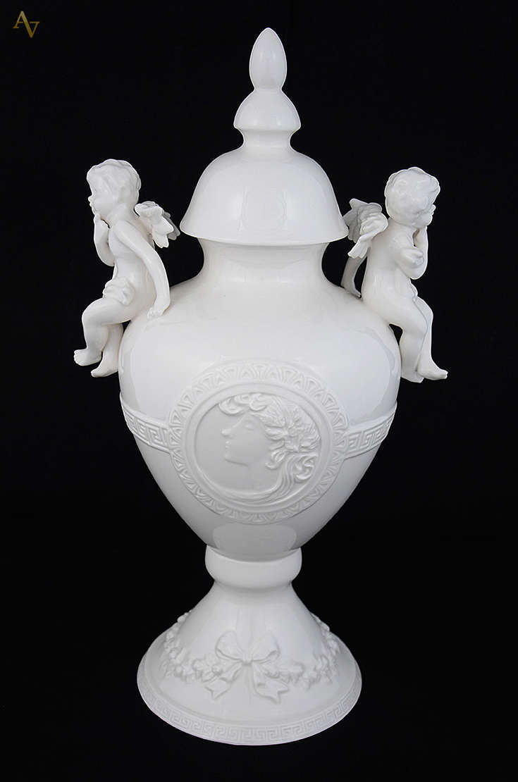 Vaso em cerâmica branca com detalhes folheados em ouro, procedência italiana. Altura 35 cm.