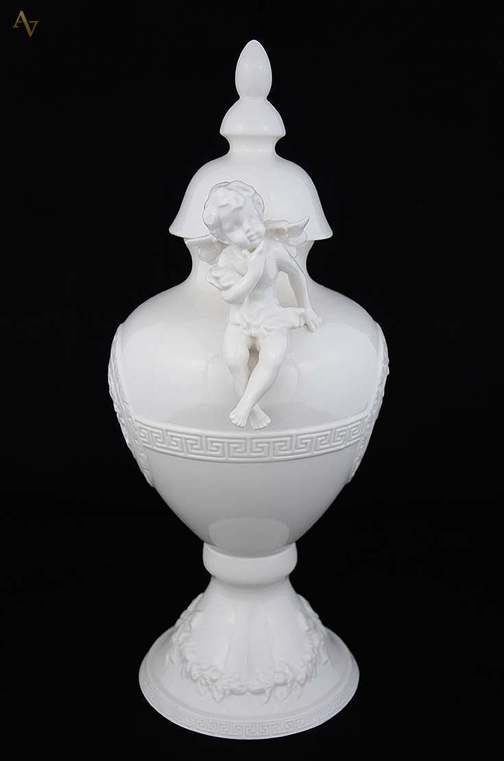 Anjo em cerâmica branca com detalhes folheados em ouro, procedência italiana. Altura 40 cm.
