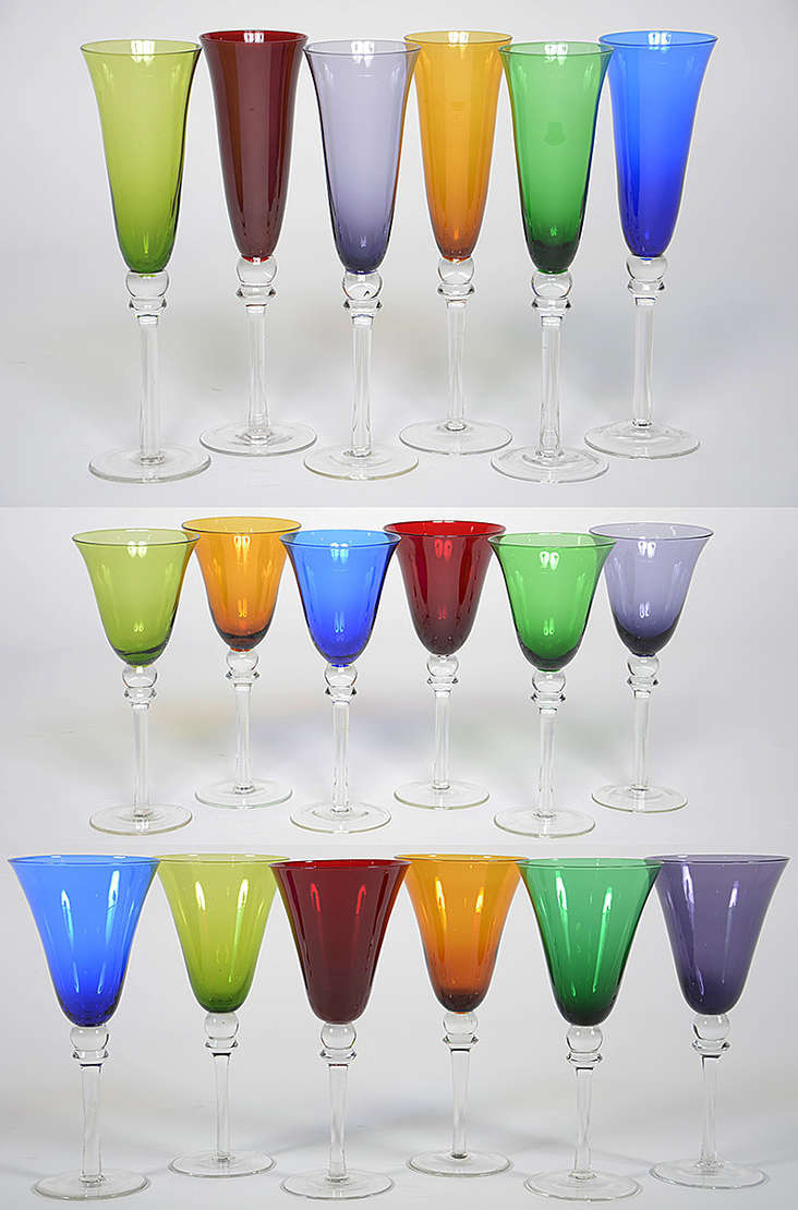 Jogo com 18 copos, sendo: 6 para água, 6 para vinho e 6 para champagne na cor vermelha.