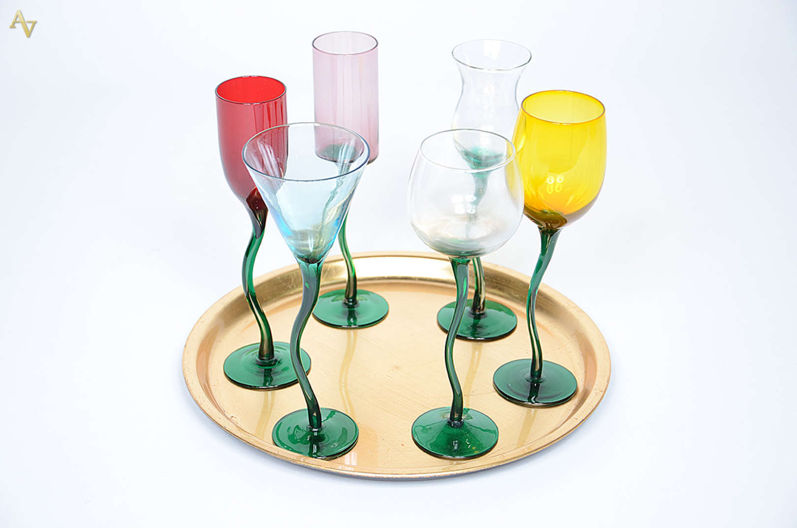 Jogo com 6 copos para vinho e bandeja (diâmetro 33 cm).