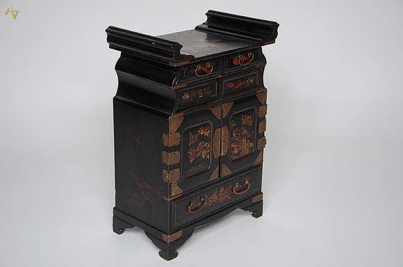 Contador chinês de madeira e metal dourado. Medidas 30 x 17 cm e altura 46 cm.