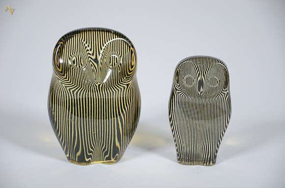 PALATNIK - Duas esculturas em resina de poliéster representando corujas. Alturas 8,5 cm e 11 cm.