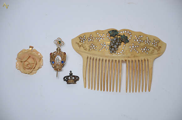 Diversas peças, sendo duas coroas para imagens (alturas 2,5 à 7 cm), pendente de marfim em forma de rosa (altura 4,5 ...