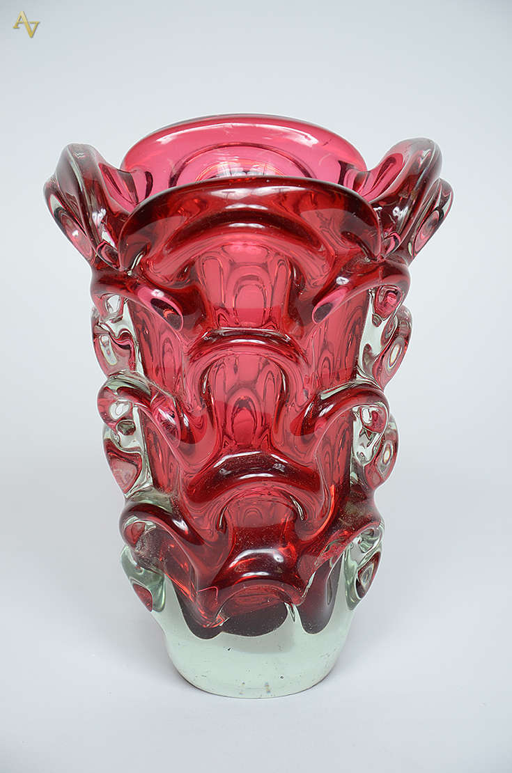 Vaso de murano vermelho degradé, interior na cor branca, flores aplicadas. Altura 24 cm (faltando parte das flores em...