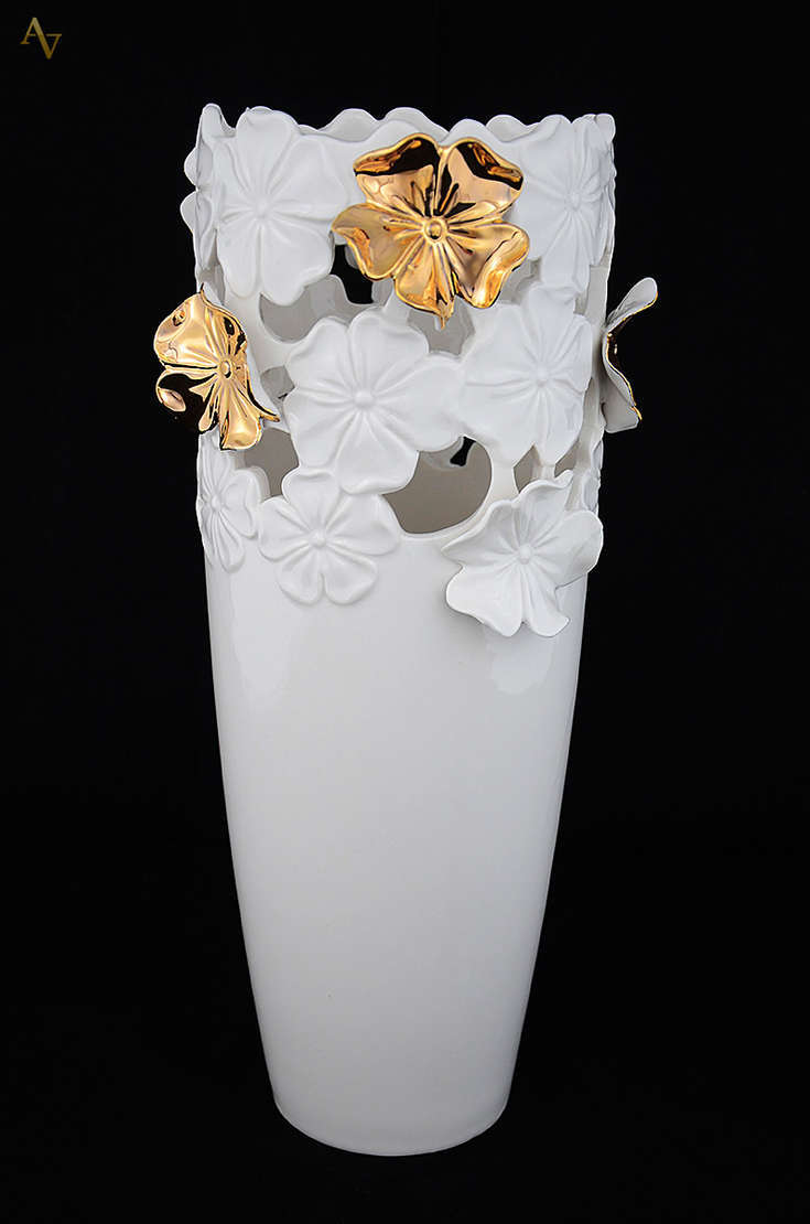 Anjo em cerâmica branca com detalhes folheados em ouro, procedência italiana. Altura 40 cm.
