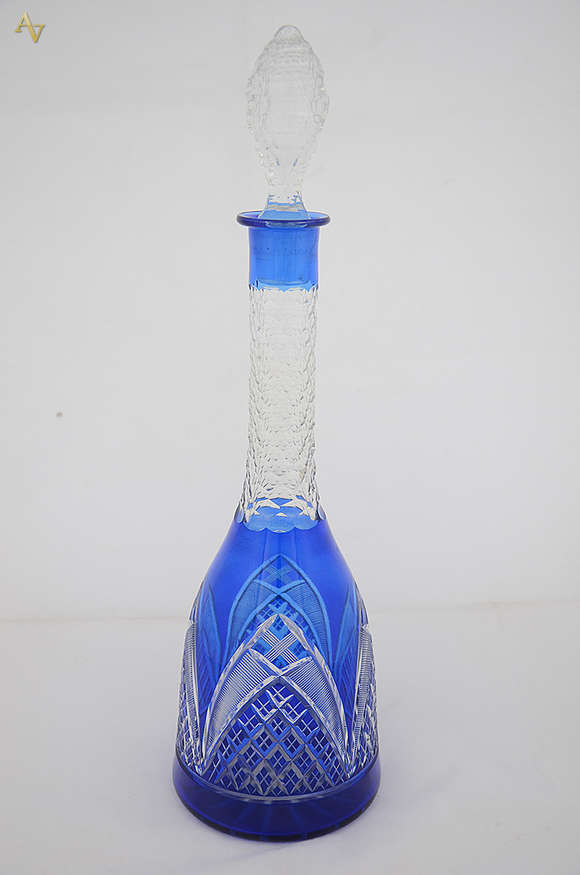 Licoreira de cristal frances lapidado doublé azul (tampa com pequenos bicados na parte interna). Altura 43 cm.